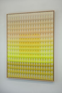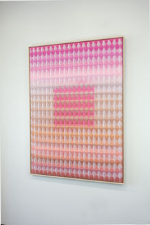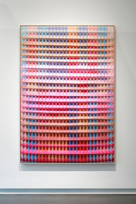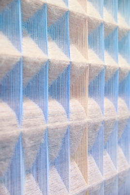 In her debut solo museum exhibition, Anya Molyviatis (b.1994, Geneva, Switzerland; SCAD B.F.A., fibers, 2021) presents a new series of her signature three-dimensional textiles exploring relationships between light and materiality. The exhibition includes Molyviatis' largest weavings to date, simultaneously exquisite in their intricate construction and powerful in their grand visual impact. In these works featuring a diamond waffle pattern developed by the artist, Molyviatis uses both the physical structure of interwoven threads and the visual cues of color juxtapositions to convey an enhanced sense of depth. To create each work, Molyviatis weaves hand-dyed cotton with mohair wool, meticulously threading thousands of fine fibers through 40 harnesses of a vintage loom - one of only 20 in existence worldwide. The resulting works harmoniously blend technology and craft, with compositions that augment our perception of weight, density, and sound through awe-inspiring designs. Enveloping the gallery in soft gradients of texture and color, Molyviatis offers visitors an extraordinary setting for contemplating and reflection.
